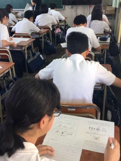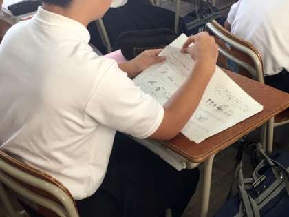 教科指導の岡先生にうかがいました。「3年生は2ヵ年分のチャレンジテストに取り組んでいます。」「チャレンジテストの問題は分量(裏表10ページ)が多く、問題文を読むことに苦労しています。」と教えてくださいました。