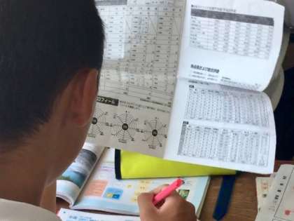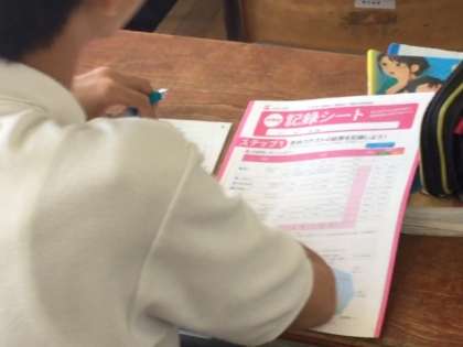 2年3・4組の体育(男子)です。男子生徒は、教室でスポーツテストのまとめをしていました。授業で計測した自己の記録を「記録ノート」にうつして成果と課題を確認します。