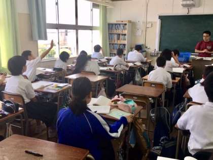 1年4組の国語の授業です。安江先生の授業では先生の問いかけに生徒が良く応えます。1つ質問するごとに、手を挙げ発言しています。