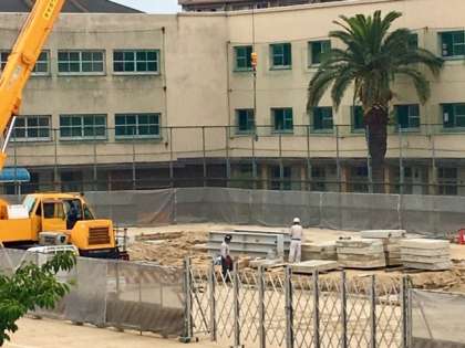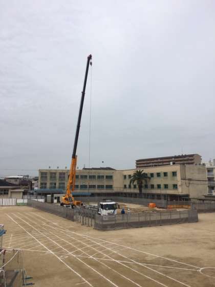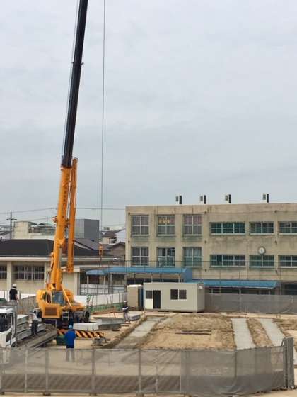 運動場に大きなクレーン車が入っています。仮設プレハブ校舎の土台の鉄骨が吊り上げられています。
