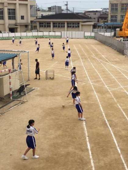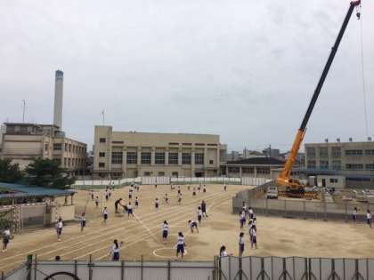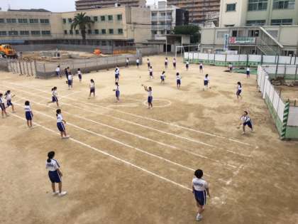 仮設プレハブ校舎建設の狭くなった運動場では、1年生が体育の授業でハンドボール投げの練習をしています。