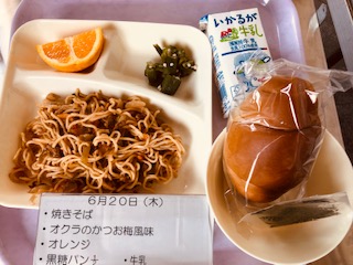 本日の給食は、焼きそば、オクラのかつお梅風味、オレンジ、黒糖パン1/2、牛乳です。