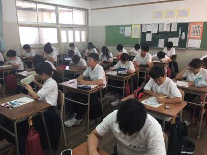 1年2組の社会の授業です。小テストに取り組んでいます。