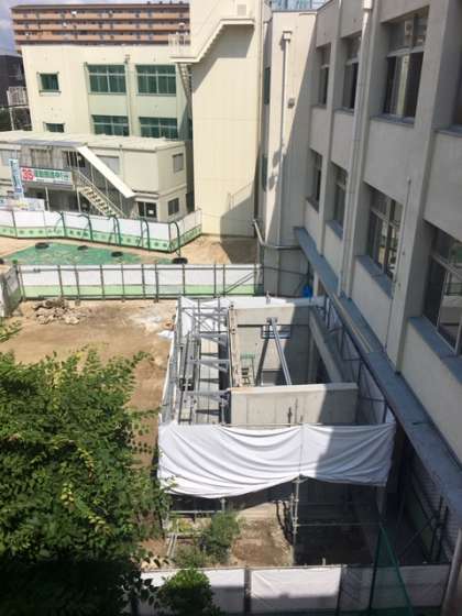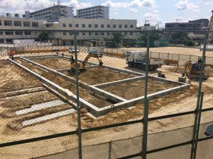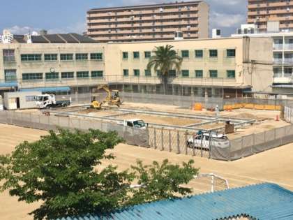 今朝の校舎建て替え工事の様子です。仮設プレハブ校舎の土台も随分整ってきました。