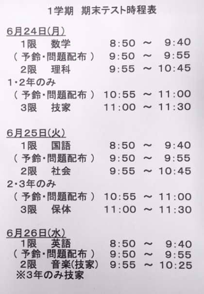 明日のテストは、1限・国語、2限・社会、3限・保体(2・3年のみ)です。