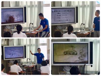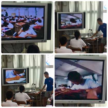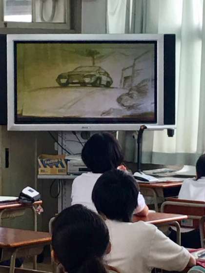 2年2組の美術の授業です。電子黒板と書画カメラを使って、風景画を描く上で必要な要素、1,構図 コンポジション、2,配置 レイアウト、3,角度 アングルについて、例示や生徒をモデルにカメラで写した写真を示して指導を受けました。生徒は熱中して話を聞いていました。