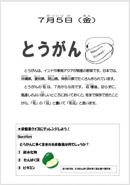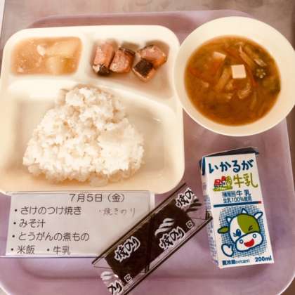 本日の献立は、鮭の付焼、冬瓜の煮物、お味噌汁、米飯、焼き海苔、牛乳です。