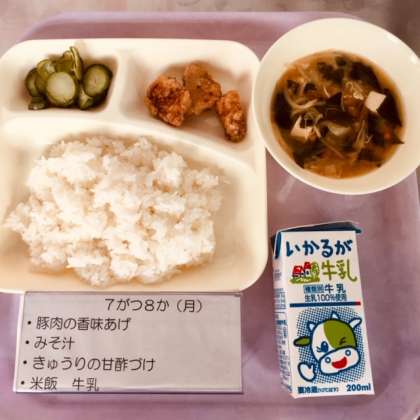 今日の献立は、豚肉の香味揚、キュウリの甘酢漬、お味噌汁、米飯、牛乳です。
