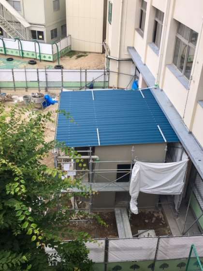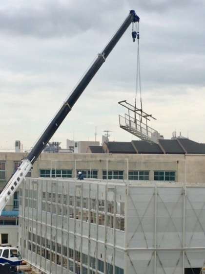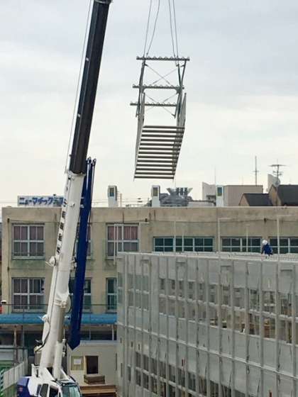 仮設プレハブ校舎がその全容を見せてきました。今日は大型クレーンで階段を取り付けていました。