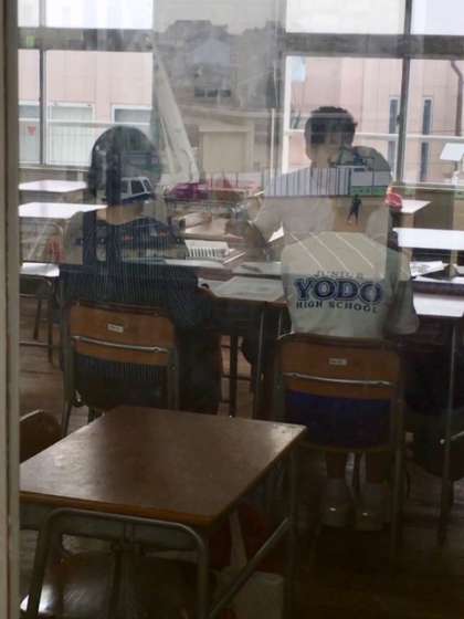 3年生の廊下には書道作品や、修学旅行の写真が展示されていました。