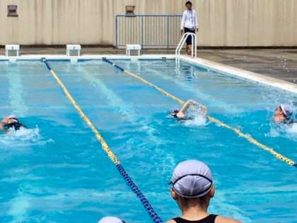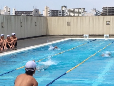 3年生の水泳授業です。今日の授業は、タイムの測定です。みんな一生懸命泳いでいます。