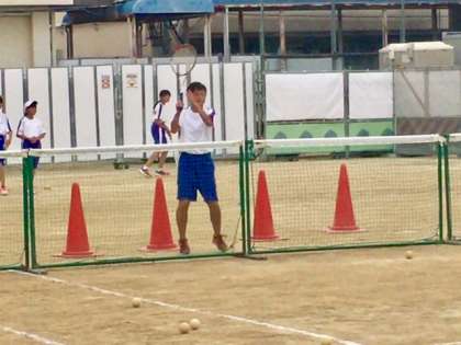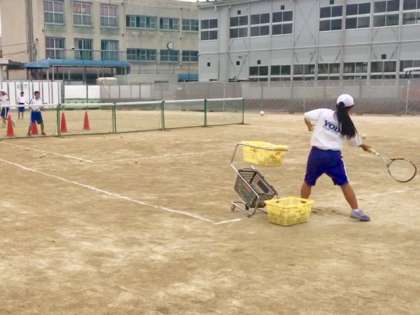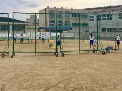 学校のグランドでは、ソフトテニス部が汗を流して練習しています。