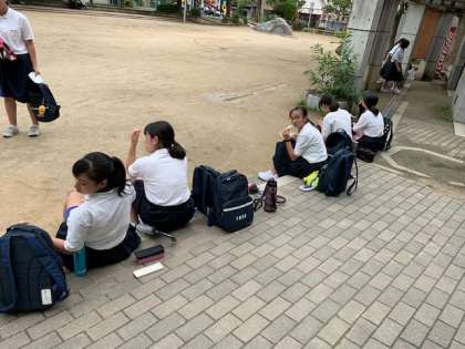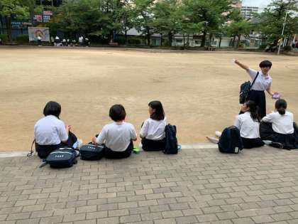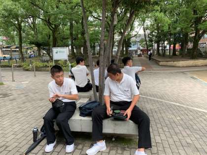 池田駅に到着しました。駅前の公園でお弁当を食べています。