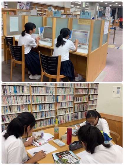 初めての大きな図書館にみんなビックリしています。関心のある事柄について検索し、資料を探しました。
