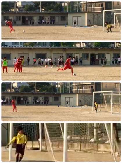 試合終了間近に、相手チームのファールでペナルティキックのチャンスが来ました。