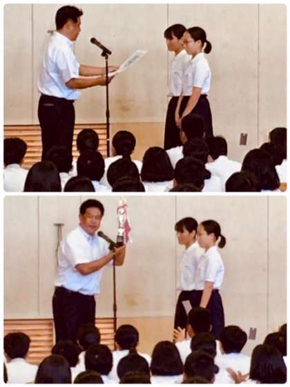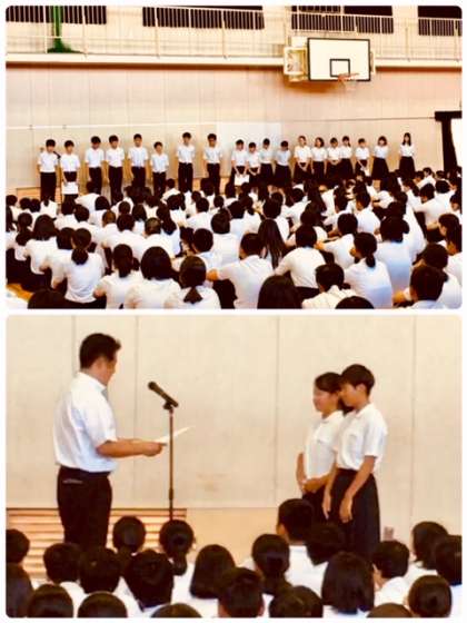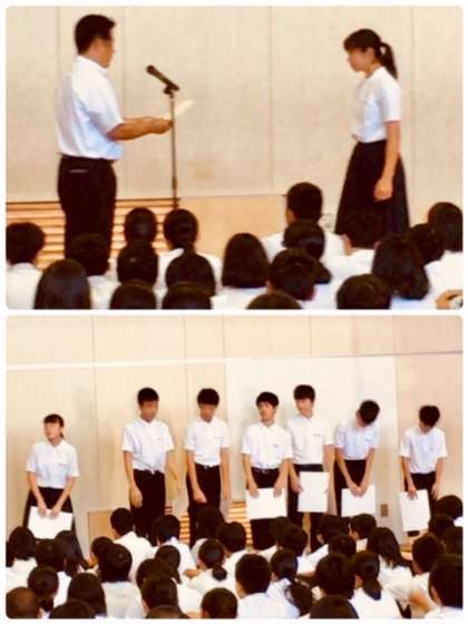 夏休み中にあった部活の大会で表彰状をたくさんいただきました。賞状伝達を行いました。