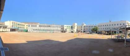 体育館入り口付近から見た、校舎全景です。明日以降、第1校舎解体ならびに新築工事のため再び仮囲いに覆われてしまいます。
