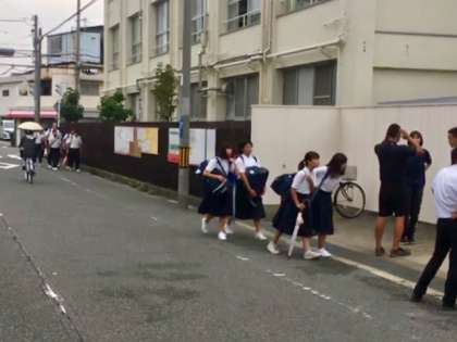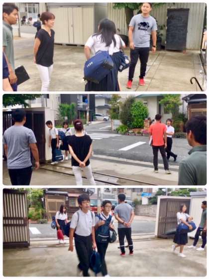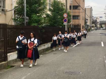 今日から2学期の授業が始まります。二学期からは、北西の通用門から登下校しています。生徒は、路側帯を登校しています。