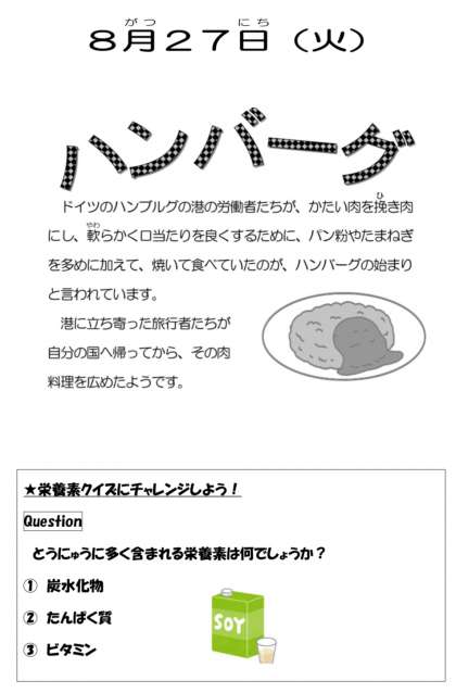 今日は子どもたちの大好きなハンバーグです。残さずいっぱい食べて二学期も頑張りましょう。