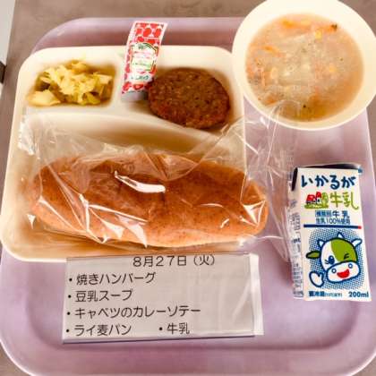 本日の献立、焼きハンバーグ トマトケチャップ添え、豆乳スープ、キャベツのカレーソテー、ライ麦パン、牛乳です。