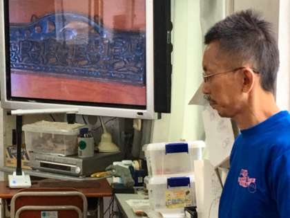 3年1組の美術の授業です。黙々とレリーフの木彫作品を作っています。増田先生が過去の生徒の作品を大型テレビに映し出して、目標を示してくれています。