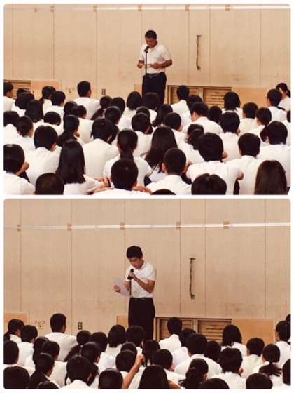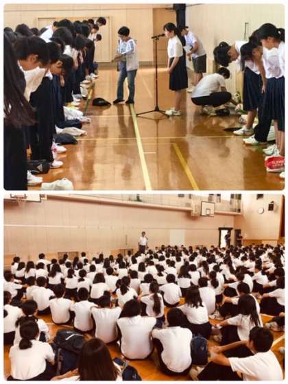 生活指導部長の櫻野先生から2点注意がありました。ひとつ目は、くつ袋を忘れないようにです。ふたつ目は、校舎建て替え工事で運動場が狭くなっているので、しばらくの間ボールの貸し出しは取りやめます。
