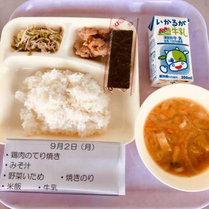 本日の献立は、鶏肉の照り焼き、味噌汁、野菜炒め、焼き海苔、米飯、牛乳です。