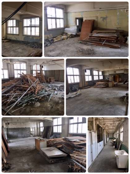 旧第1校舎の解体工事が進んでいます。概ね図書室、和室、放送室、職員室、校長室、放送室、相談室、事務室、保健室、給茶室の内部は解体されて整理を行っています。