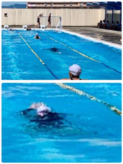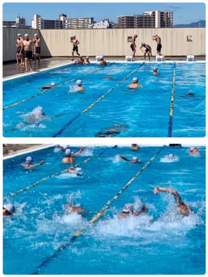 水泳の授業です。クロール、背泳ぎ、平泳ぎなど様々な泳ぎに挑戦しています。