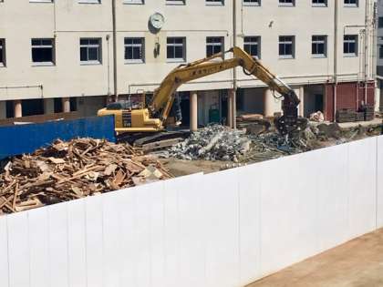 今日は、給茶室が解体されました。大きな重機のハサミでコンクリートの建物が木っ端微塵です。