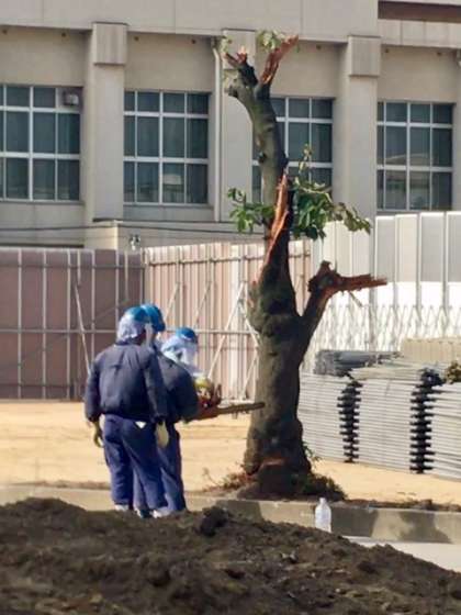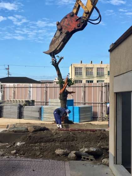 朝の工事の様子です。この時には、給茶室の形はまだありました。校庭の桜の幹をチェーンソーで切り倒しました。