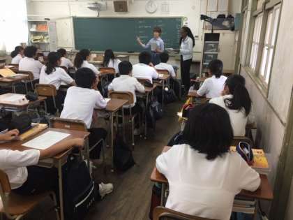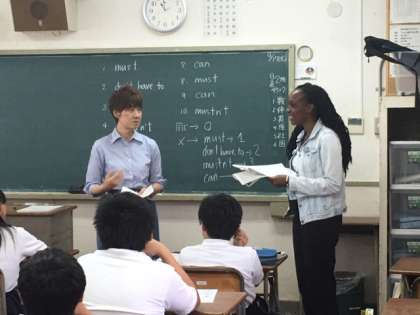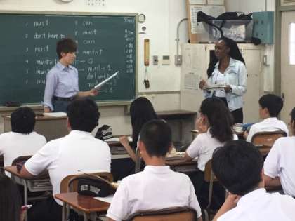 2年2組の英語の授業です。C-net のテニーシャ先生と英語担当の井吉先生が授業を進めています。井吉先生からテニー先生にアメリカの学校、ジャマイカの学校の話を聞きながら、日本の学校との違いを教えてもらいました。