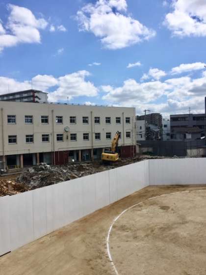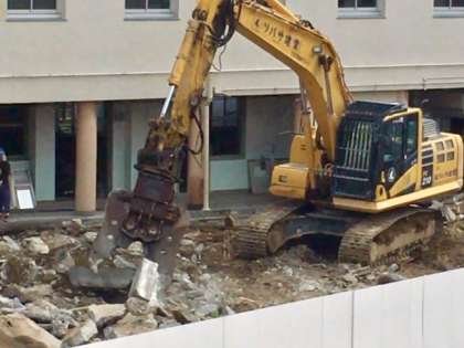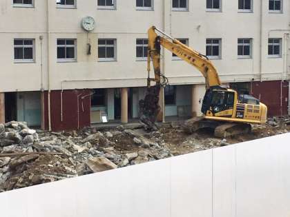 第1校舎前のコンクリートの土間をはがしています。重機の大きなハサミで太い柱も真っ二つに砕かれていました。