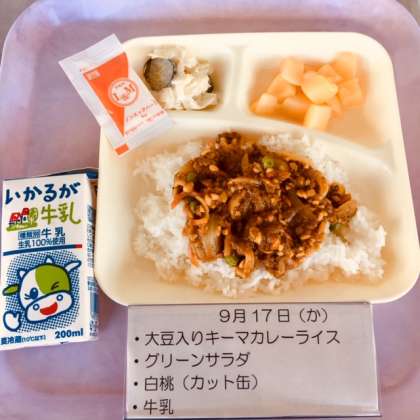 本日の献立は、大豆入りキーマカレーライス、グリーンサラダ、白桃(カット缶)、牛乳です。