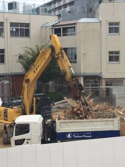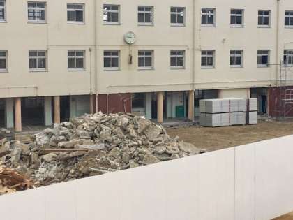 校舎建て替え工事の様子です。第1校舎前のコンクリート土間がなくなりました。池も跡形が見られません。着実に工事は進んでいます。