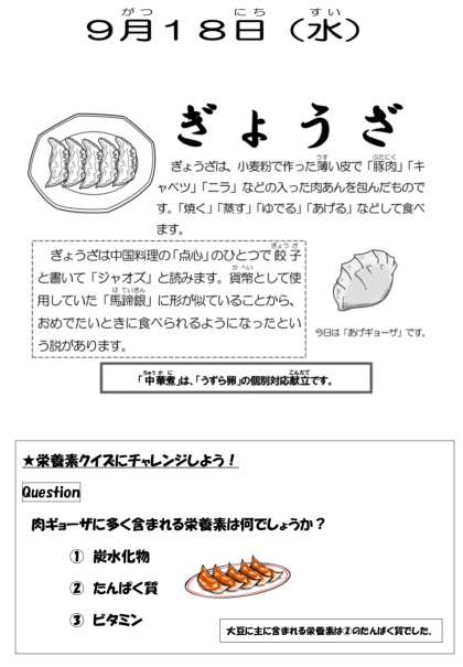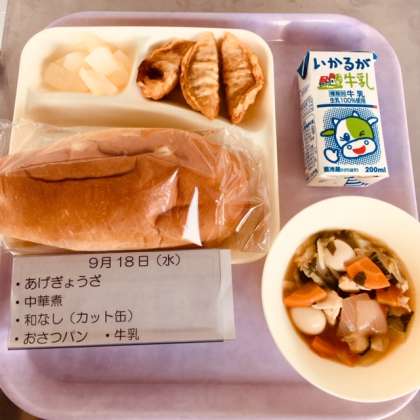 さて、今日の献立は、揚げ餃子、中華煮、おさつパン、和梨(カット缶)、牛乳です。