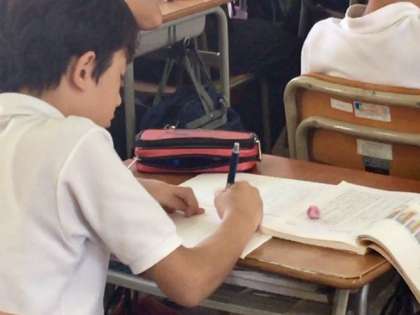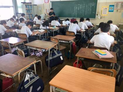 1年3組の国語の授業です。少人数制で、クラスを半分ずつに分けて学習しています。田口先生担当の授業は、オノマトペを学習しています。