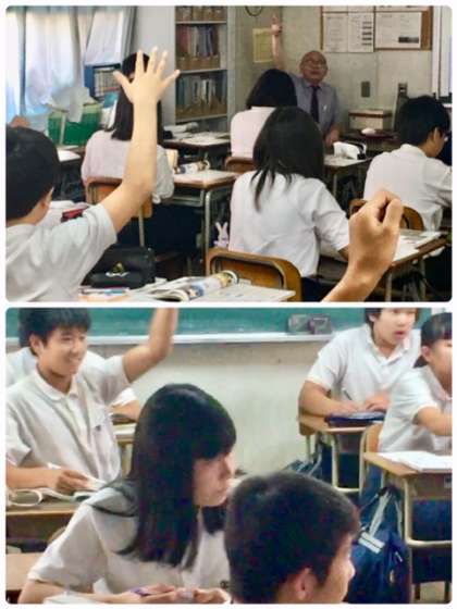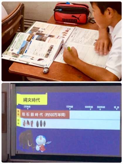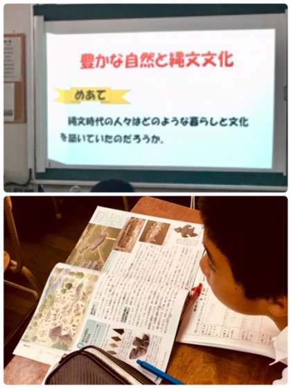 1年2組の社会の授業です。縄文時代について学習しています。田中先生の授業では、毎回、わかりやすいパワーポイントを作って進められています。とてもわかりやすいためか、先生の質問に、生徒の手がたくさんあがり発表してくれます。