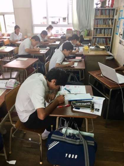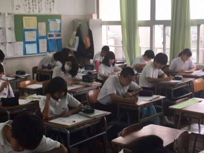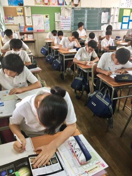 3年4組理科の授業です。授業の振り返りの練習問題に、真剣に取り組んでいます。