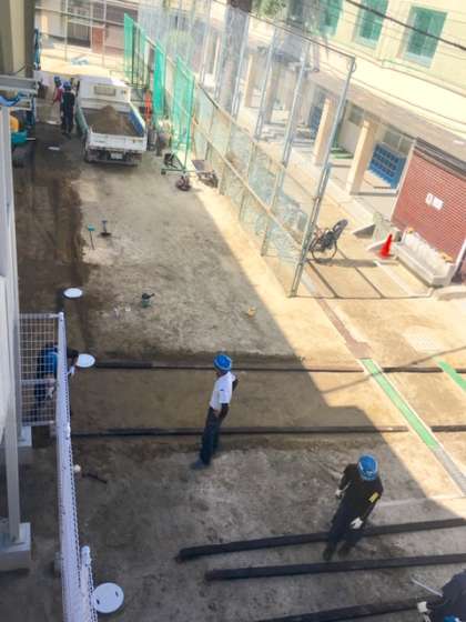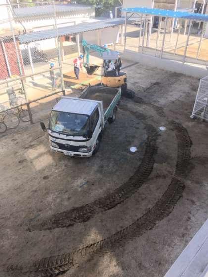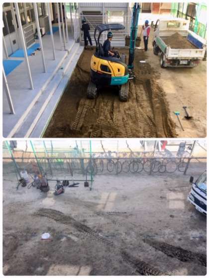雨が降るとプレハブ校舎前が泥濘むため、アスファルト舗装の工事を行います。
