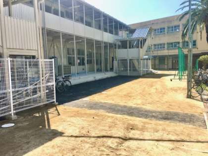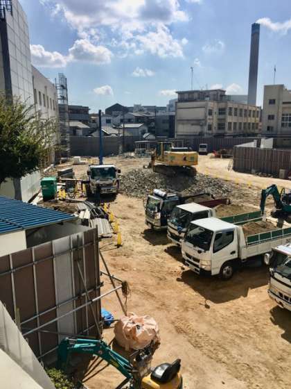 校舎建て替え工事の様子です。上の写真は第1校舎前です。池や給茶室、渡り廊下など取り除かれています。