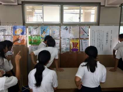 被服室では音楽科の1年生夏休み中の課題よで、好きな楽器を選んで、その歴史や演奏法を調べてまとめました。その中の優秀作品の発表です。