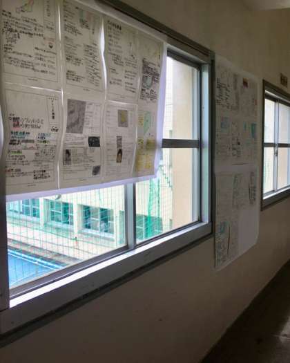 1年社会科「地理新聞」です。夏休み中の課題で世界の国々を調べてまとめました。来日生徒の作品では、母語で書かれた新聞も発表されていました。