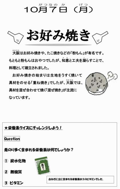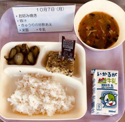 本日の献立は、お好み焼き、豚汁、キュウリの甘酢和え、米飯、牛乳です。