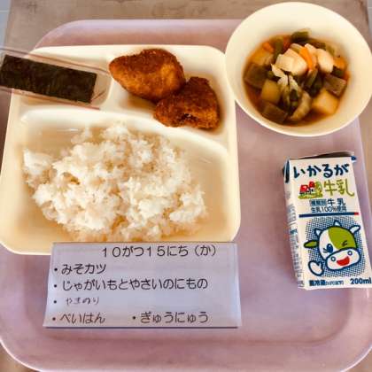 本日の献立は、名古屋名物の味噌カツです。ジャガイモと野菜の煮物、米飯、焼き海苔、牛乳です。