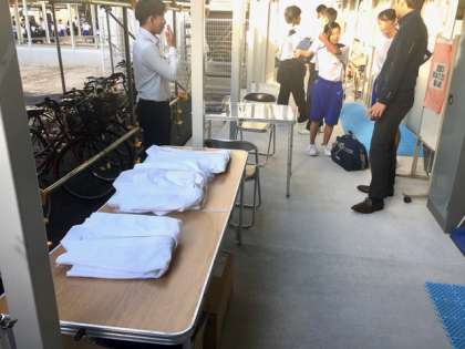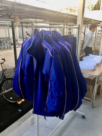本日と明日の2日間、ウインドブレーカーと柔道着の展示販売がありました。サイズ合わせが必要な生徒は、明日までに試着して申し込んでください。