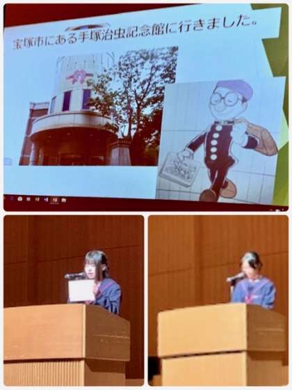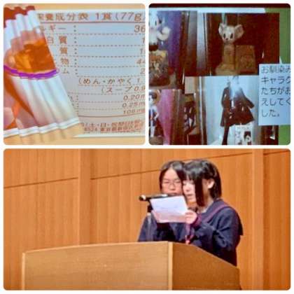 今年の夏休みに開催された読書散歩の研究発表を行いました。初めて大舞台ですが、2年生の岩田さんと池長さんが堂々と発表しました。