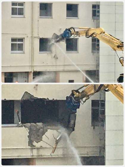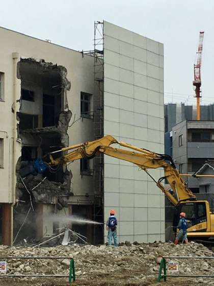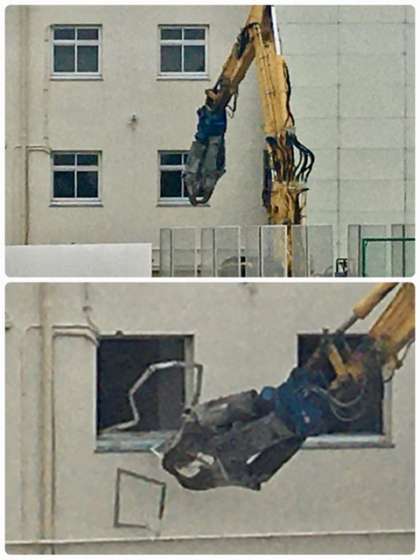 今朝から、第1校舎のの解体工事が本格的に始まりました。慣れ親しんだ校舎が解体され始めました。ほんの10数分で窓枠、外壁や廊下も解体されました。