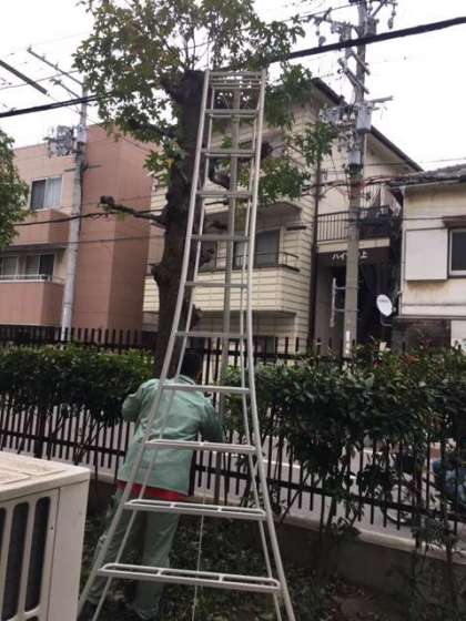管理作業員さんが、第二校舎裏の樹木の選定をしてくださっていました。校舎建て替え工事の関係で、作業が大変ですが、学校の学習環境を整えてくださって感謝します。