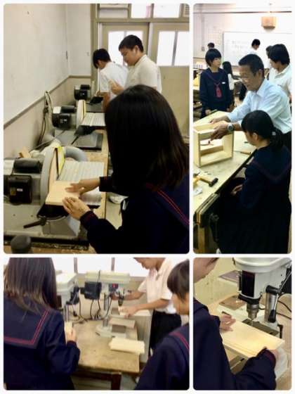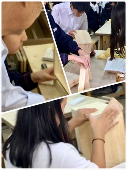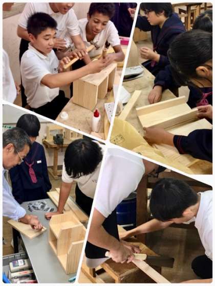 1年2組の技術の授業です。木工で本棚を作っています。慣れない工具を使って釘を打ったりノコギリを曳いたり、熱心に作っています。実に楽しそうです。